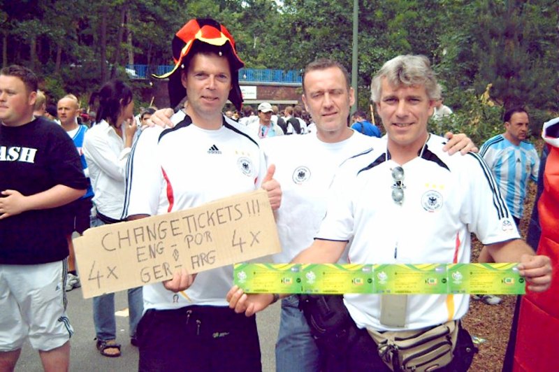 die Lampen an. Die Tresenfachkraft bekommt den Auftrach ein Stück Pappe und einen schwarzen Edding zu besorgen. Eingekleidet sitzen wir vorm Hotel und ich schreibe auf das Pappschild „Change Tickets“. Noch eine allerletzte Runde und wir los zum Ku`damm. Eher müdes Lächeln als das etwas greifbares passiert. An der Gedächtniskirche werde ich dann nett von meinem Nachbarn Andreas Knötzke begrüsst. Wie klein die Welt doch ist. Er ist ohne Karte in der Stadt und möchte sein Glück versuchen. Unsere Hoffnung der Irish Pup im Europacenter ist ein Flop. Kurzer Stop bei Mc und rein ins Taxi zum Stadion. Eygor hält einen 10minütigen Turboschlaf im Auto. Als wir ankommen ist er wieder richtig fit. Wir postieren uns mit unserem Pappschild an der Stelle, wo alle Bahnfahrer vorbei müssen um ins Stadion zu gelangen. Manche lachen nur, einige geben den nettgemeinten Hinweis das wir am falschen Stadion stehen etc.. Schnacker!!! Wir setzen darauf, das bei der Ticketvergabe jeder genommen hat, was zu kriegen war. Damals stand ja noch nicht fest wer im Viertelfinale in Berlin spielt. Wir setzen auf Engländer oder Portugiesen die es aus eben diesem Grund nach Berlin verschlagen hat. Und tatsächlich, nach 20 Minuten Wartezeit kommen vier Engländer vorbei. Drei von ihnen wollen den Tausch sofort perfekt machen. Einer ziert sich. Was soll das denn jetzt? Seine Kumpel bepöbeln ihn. Bieten ihm sogar Geld. Das ist wohl der Arne aus England. Nichts zu machen, die hauen ab. Einige Minuten später sind die wieder da. Aber die hofften nur ihren Kumpel weich zu klopfen. Wir bleiben locker, es ist noch genug Zeit bis zum Anpfiff. Eygor ist los einen Bierverkäufer suchen. Hoffentlich hat er Glück. Verdammt trocken hier!