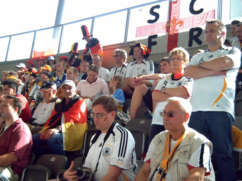 Nationalhymne! Gänsehaut, wie schon in München. Das Spiel schleppt sich so dahin. Später werden bestimmt irgendwelche Experten die Zungen schnalzen und von einer taktischen Meisterleistung sprechen. Die gigantische Stimmung trägt uns mit. Aus dem Nichts dann plötzlich das 0:1. Der Ausgleich lässt auf sich warten. Hat da jemand das verkehrte Drehbuch geschrieben? Klose trifft. Was hier jetzt stimmungsmässig abgeht ist gigantisch. Das Spiel quält sich bis zum Elferschiessen. War ich das gesamte Spiel angespannt und nervös, so bin ich jetzt ganz ruhig. Jetzt bin ich mir sicher, wir gewinnen. Wir sind Deutschland, wir gewinnen jedes Elferschiessen. Lehmann hält den 2. Elfer. Don`t cry argentina! Kleines untersetztes Maradona, kannst die Koffer packen, das war Lospech! Die Spieler unten auf dem Rasen machen Party. Auf den Rängen geht alles!! Erst später wird uns bewusst, was wir hier erleben durften. Historisches Spiel und wir waren dabei. Die Rückfahrt zum Hotel geht sehr zügig und wir sind pünktlich zum Anpfiff Italien – Ukraine vor dem Fernseher. Inzwischen sind Sabine und Christian da, Scheffin und Scheff vom Heidelberg. Die „Familie Beckmann“ wird von beiden herzlichst begrüsst.
