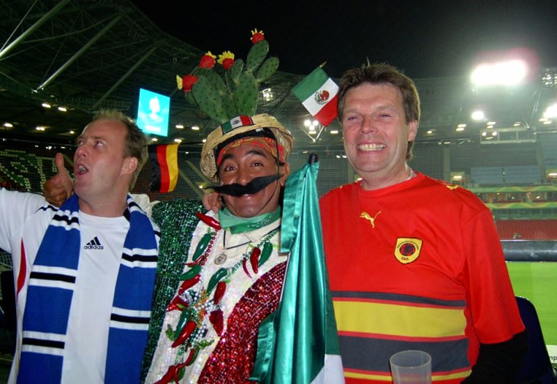 Wieder andere schlafen in irgendwelchen Vorgärten mit dem Sombrero im Gesicht. Vorm Stadion auch alles voll mit Mexikanern. Wollen Karten kaufen. Bieten bis zu EUR 500,-. Auf Nachfrage erzählen uns einige, dass sie 6.000,- Dollar für Flug, Hotel und Tickets in Mexiko bezahlt haben. Nur leider war der Reiseleiter in Frankfurt verschwunden. Die jetzt also hier ohne Hotel und Tickets. Arme Kerle. Aber Geld scheinen die alle zu haben. Immer dreistere Angebote für die Karten. Plötzlich eine Hand von hinten! Ich drehe mich um und der Reporter vom Live Fussisender aus Mexiko fragt ob ich zur Verfügung stehe. Nach meinem perfekten „Si“ noch hier und da ein bisschen Puder, der Scheinwerfer geht an und los geht es mit meinem ersten Liveinterview im Mexikanischen Fernsehen. Mülli gleich hinterher. Holland –Elfenbeinküste gucken wir direkt vorm Stadion in einem Biergarten auf Grossbildleinwand. Total trockene Kehle vom Fernsehauftritt. Da schadet auch kein Becks Gold denke ich. Erst mal Flüssigkeitsverlust ausgleichen. Schon wieder eine Hand von hinten. Dieses Mal eine dpa Pressetante. Sie zeigt mir nett Ihren Presseausweis und sieht zudem noch hübsch aus. Sie zückt Ihren Stenoblock und notiert meine Antworten. Sehr erstaunt ist sie als ich meine afrikanische Vergangenheit in Namibia und Angola schildere. Deswegen ja auch mein Angola Trikot. Zumindest verkneife ich mir die Geschichte, wo ich als kleiner Junge unserem Hauslöwen einen kleinen Haps aus meiner linken Hand anbieten wollte. Die 2:0 Führung für Holland bekomme ich nur halb mit. Die fragt und fragt. Gürgel bringt Bier. Endlich fertig, bin mal gespannt welche Zeitung diese Story druckt. Ernenne nun spontan Lobo als meinen Mediendirektor. So bin ich nun meine Sorgen los und habe nun Zeit die Elfenbeinküste anzufeuern. Der gesamte Biergarten steht hinter diesem Team und hofft noch, zumindest auf den Ausgleich. Noch 2,3 Becks und ab ins Stadion. Ist das ein Fussballspiel? Angola mit Libero lässt nichts anbrennen und ermauert sich das 0:0 ohne eigenen Torschuss. Mexiko fällt nichts ein.