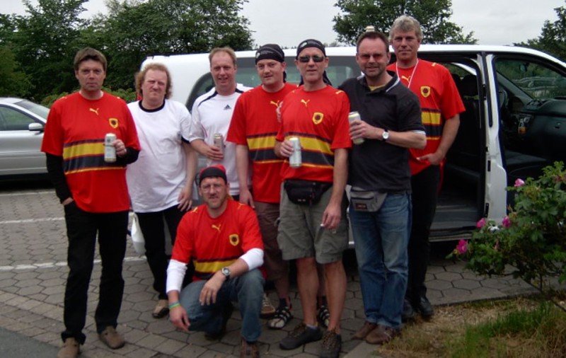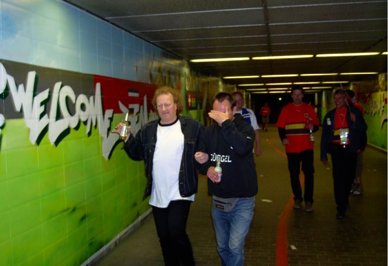 Auf der A1 Richtung Hannover geht die Autoparty los. Volle Lautstärke Lotto King Karl und Udos Reeperbahn. Nach Spliff und City mit am Fenster kommt „was wollen wir trinken“ und die Stimmung geht gen null, weil plötzlich völlig unerwartet das Bier alle ist. Das war blauäugig von uns nur eine Kiste mitzunehmen. Jetzt wird die Tanke reich gemacht. Weiterhin volle Lautstärke bis Hannover. Jetzt ist es erst mittags und wir beerdigen schon Konny. Man, man, man was für eine Party. Eigentlich schon genug für heute erlebt! Zur Akklimatisierung in Niedersachsen setzen wir uns in die 1. Kneipe und probieren Gilde. Na ja, das kann ja was werden. Die Stadt wimmelt, alles voll mit Mexikanern. Die grün, wir blau trotz unserer roten Angola Trikots.