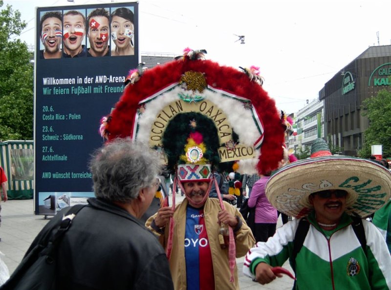 Mit eben diesem gehe ich bei MC rein und bestelle einen Burger mit Gnu und Antilopenfleisch wie bei uns in Afrika. Die überforderte Mitarbeiterin (des Monats?) holt den Scheff, der mir in gebrochenen Englisch erklärt, dass es in Europa nur Rinderburger gibt. Egal, erst mal was essen. Jetzt wird es Zeit auf der Fanmeile anzukommen. Argentinien – Serbien M. beginnt gleich. Als das 1:0 fällt, merken wir das wir auf der falschen Party sind. Das ist eine Mexiko Fete hier, mit dem entsprechenden Bier. Das richtige Fest ist schräg gegenüber und wir treffen beim 3:0 ein. Erst mal Guido ob seines Geheimtipps per Handy bepöbeln. Zum Ende 6:0 Hammerhart. Der Weg zum Stadion ist unbeschreiblich. Mexikaner mit Zorro- und Catchermasken, einige als Inkas verkleidet. Atahualpa ist auch dabei.