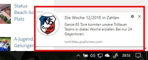 Wenn Du Google Chrome oder Firefox als Browser nutzt, dann kannst Du automatisch über jeden neuen Beitrag auf der TSV Trittau Fußball Homepage sofort in Deinem geöffneten Browserfenster am PC benachrichtigt werden. (funktioniert nur am PC, nicht am Handy)